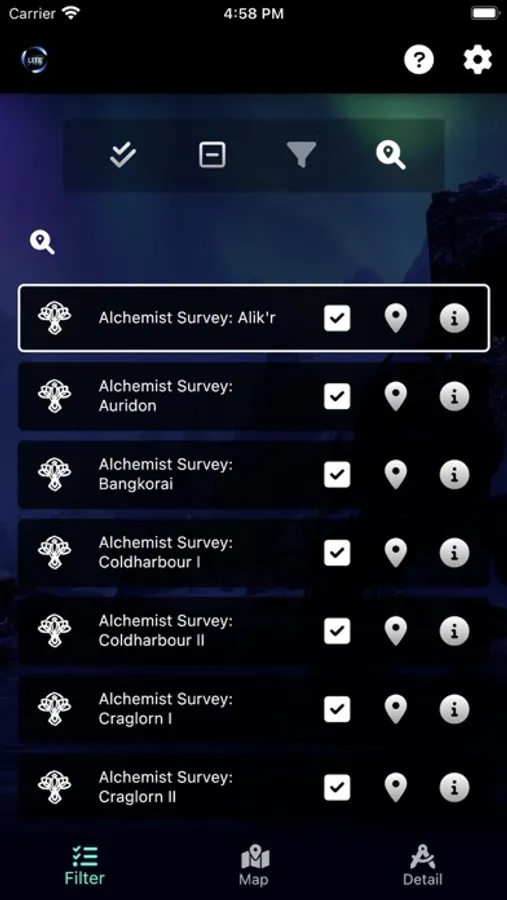 ESO Surveyor Lite version covers the ESO base game only and does not contain surveys and treasure maps for DLC zones such as High Isles or The Deadlands. The full version (this version) is unrestricted.