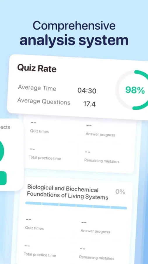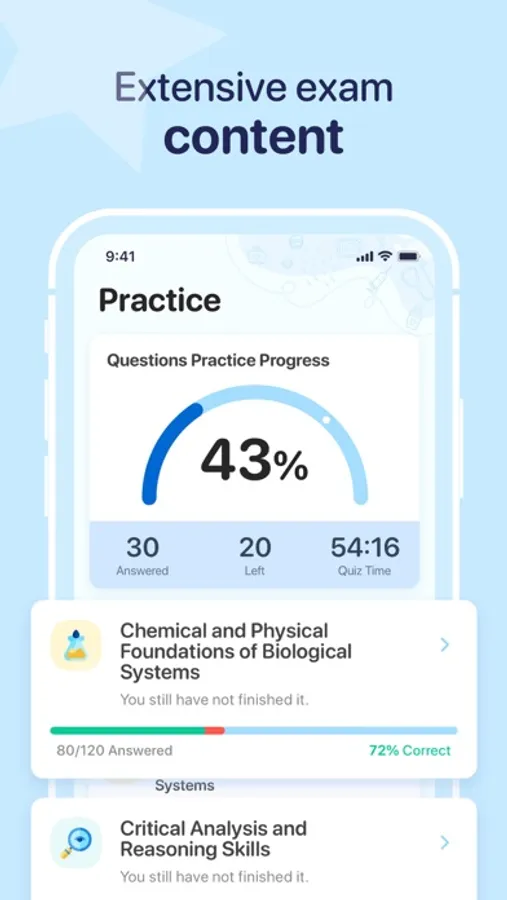 In MCAT Prep 2023, there are a large number of questions prepared by exam experts that cover the range of standardized exam requirements. Depending on the exam requirements, you will need to master 4 subjects, each containing multiple subdivision of content areas. You have the flexibility to choose which subjects you need to practice, depending on your situation.