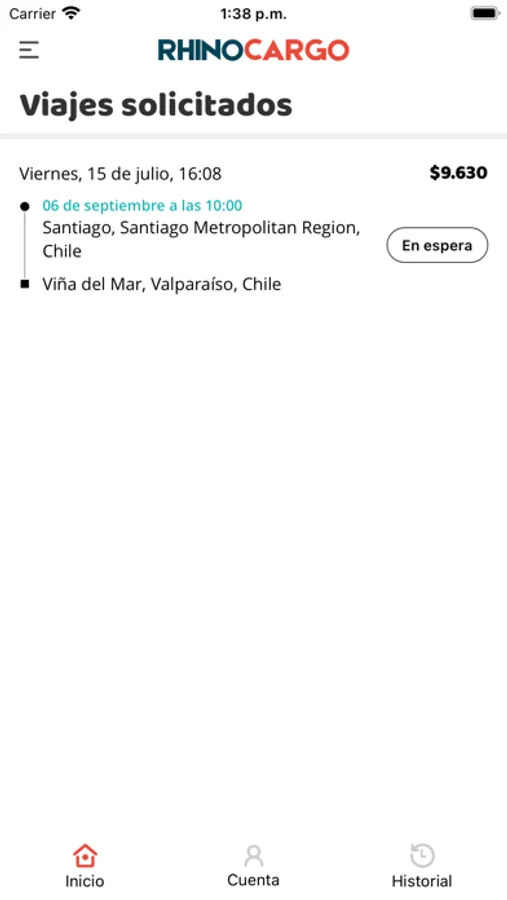 Se confirma el viaje y se genera una ficha de resumen. Este viaje quedará a la espera que un conductor perteneciente a la flota de RhinoCargo lo acepte.