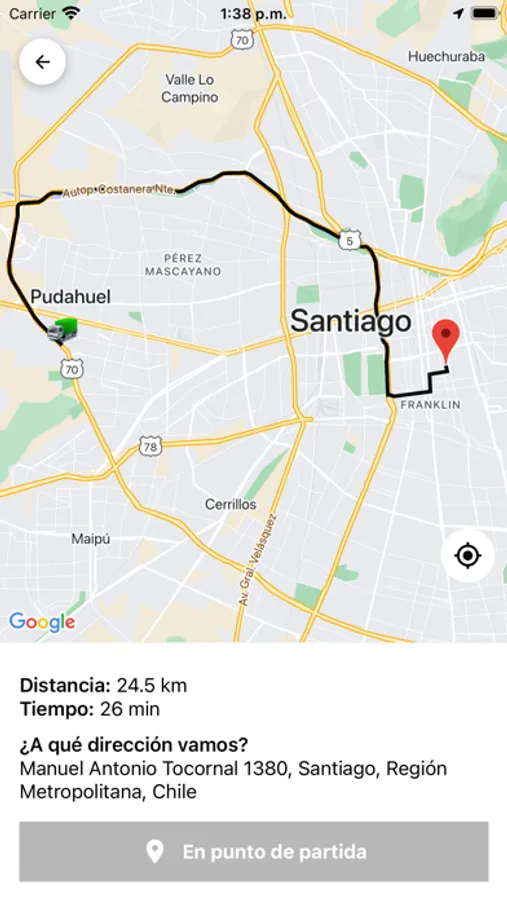 El conductor se dirige a la primera dirección a retirar la carga, cuando su vehículo está cerca se activa la opción en punto de partida y se cambia la dirección del GPS a la segunda dirección o destino final. Para iniciar el viaje a destino, se presiona la opción iniciar viaje a destino. Finalmente cuando el conductor está en el destino final debe seleccionar finalizar viaje y la entrega de la carga se da por realizada.