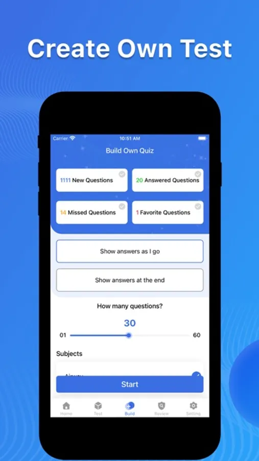 Create your personal practice tests based on answered questions, missed questions, weak subjects and new questions. You can set numbers of questions based on your free time to study on a daily basis