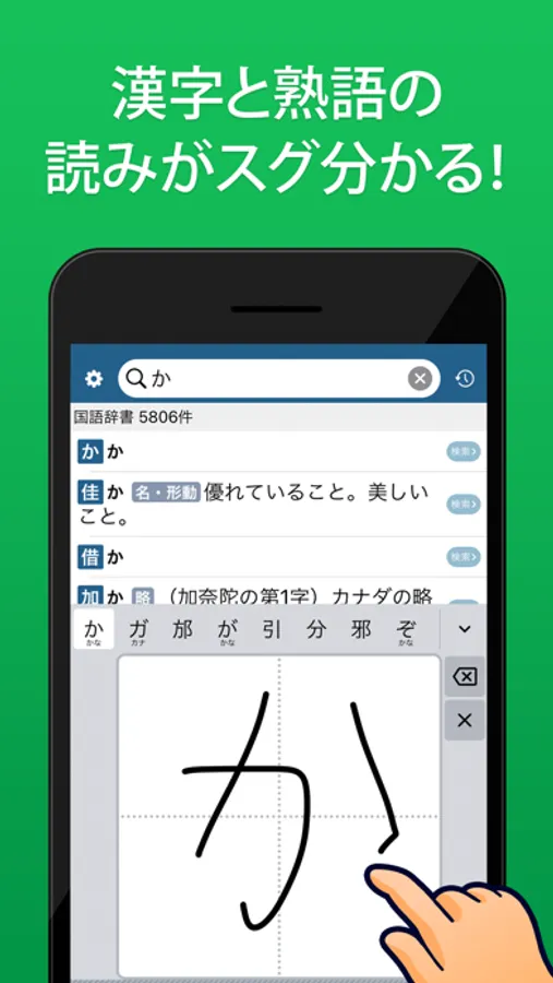 漢字を手書きするだけで、その漢字の読み方はもちろん、候補となる熟語の意味と読み方まで一発表示!