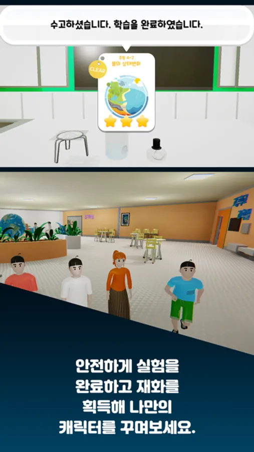- 초등학교 과학교실로 입장하여 자리에 앉아 실험을 선택하여 진행하세요.