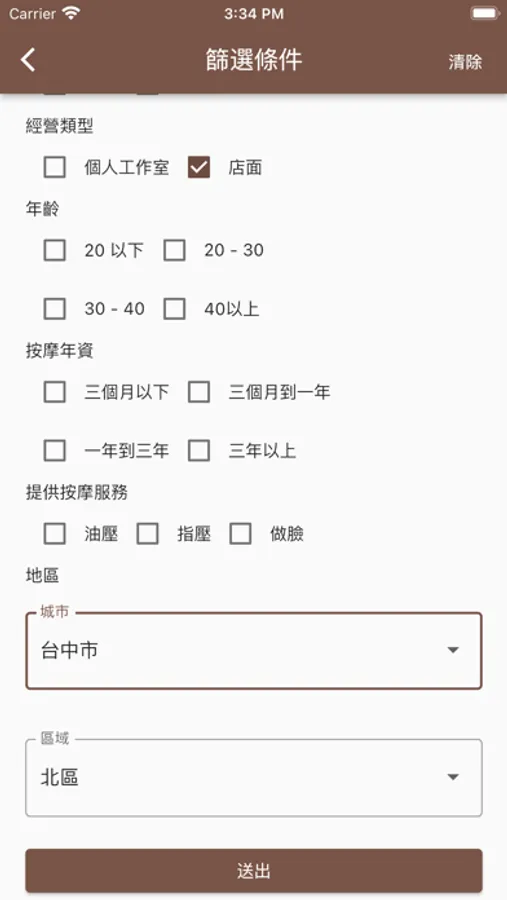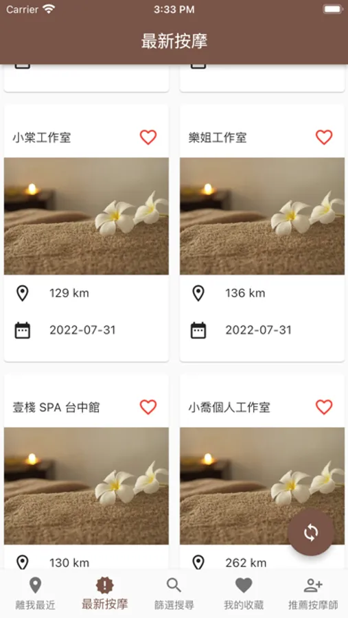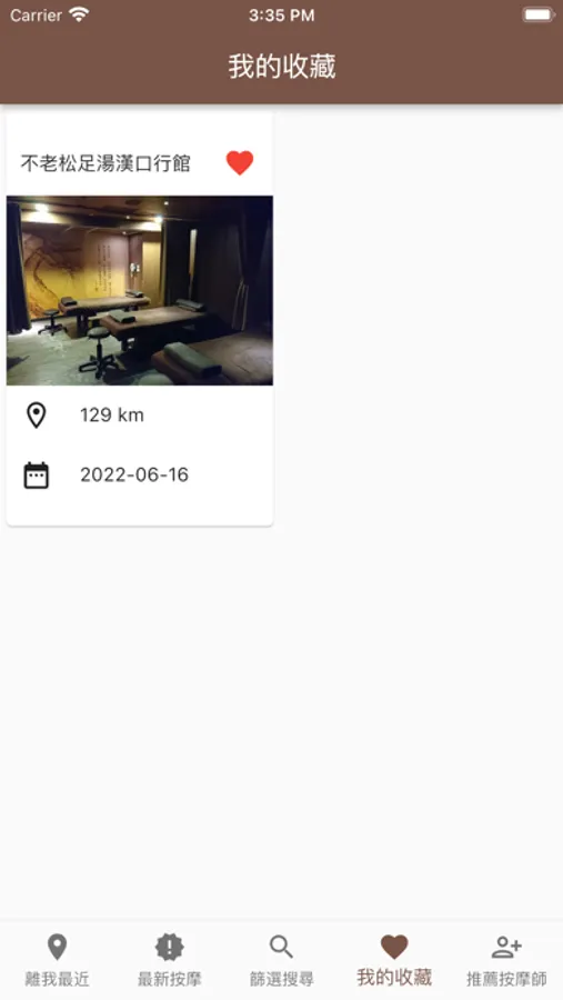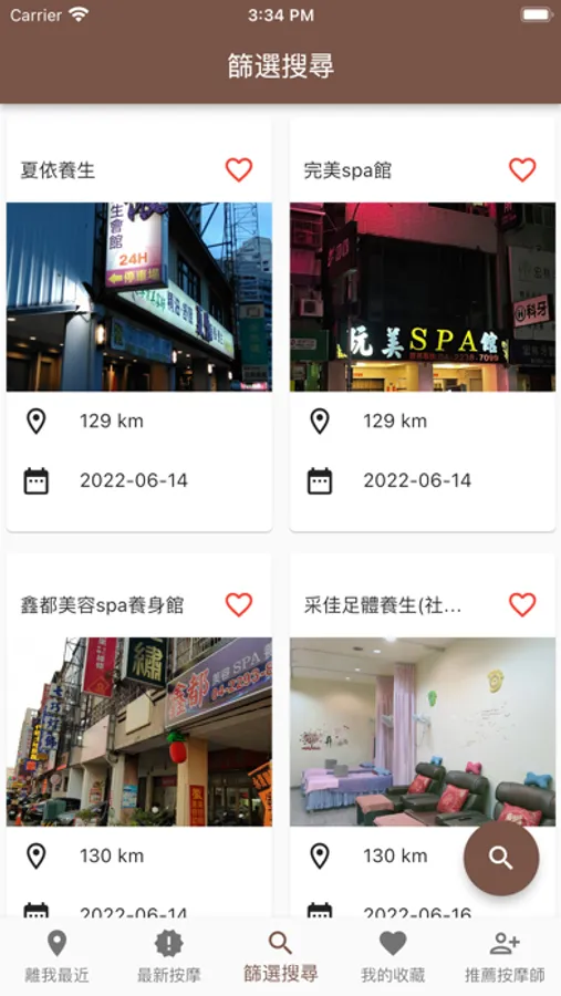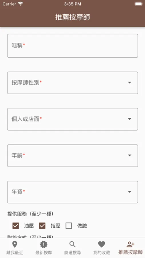 主要功能:離我最近、聯絡按摩館(師)、最新按摩、篩選搜尋、我的收藏、推薦按摩師。