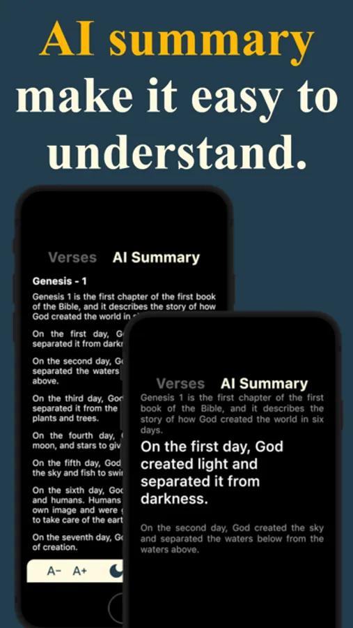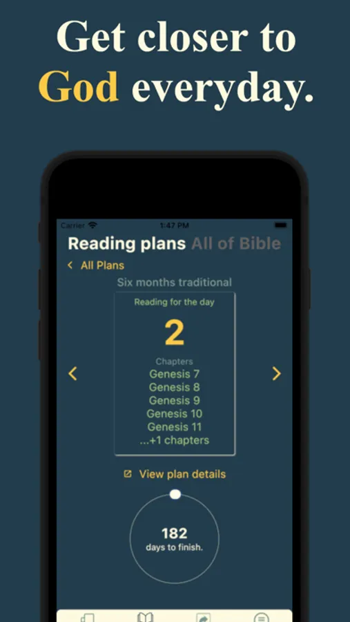 Choose from yearly, half-yearly, quarterly, and monthly bible reading plans to get closer to God. Read/listen to the Bible along with an AI summary and get inspirational verses on your home screen with a single app.