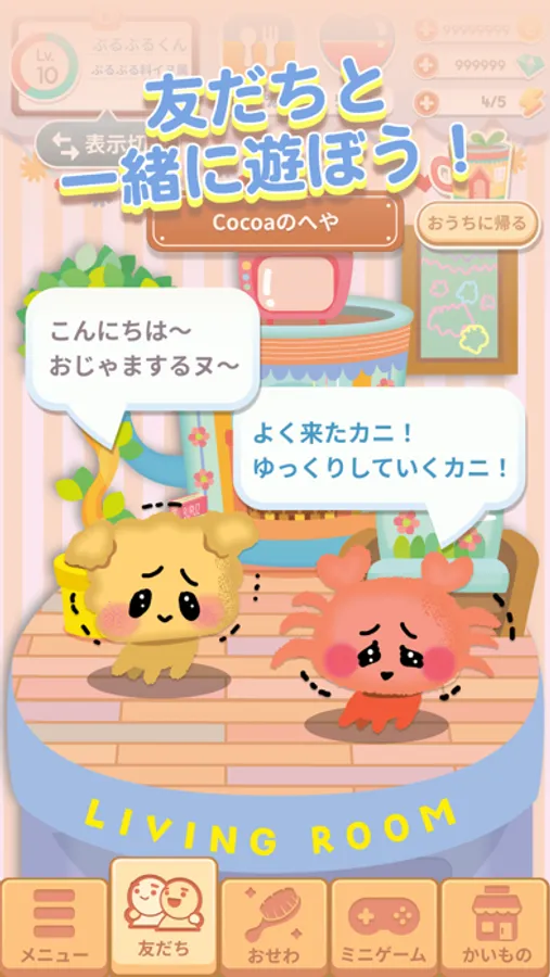 友だちの家に遊びに行って、友だちのぶるぶるを一緒にお世話したり、友だちのぶるぶるとおしゃべりしたりもできるよ。