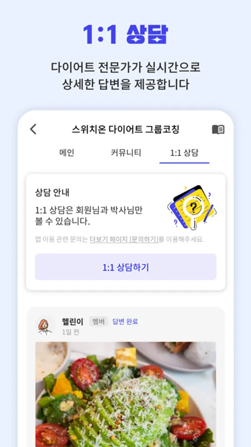 다이어트 전문가와 직접 1:1 상담을 할 수 있는 기능을 제공합니다. 사용자들은 개인적인 상담을 통해 자신에게 맞는 식습관 및 운동 방법 등 종합적인 다이어트 방법을 찾아갈 수 있습니다.