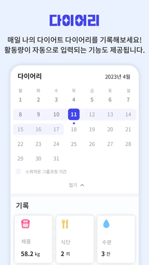 기존 줄다에서 제공되던 가이드북과 다이어리 기능을 그대로 이용하면서 더욱 업그레이드된 기능도 이용해보세요. 다이어리에는 다이어트 일지를 작성할 수 있고, 가이드북을 통해 건강한 식습관과 운동 방법 등에 대한 정보를 얻을 수 있답니다.