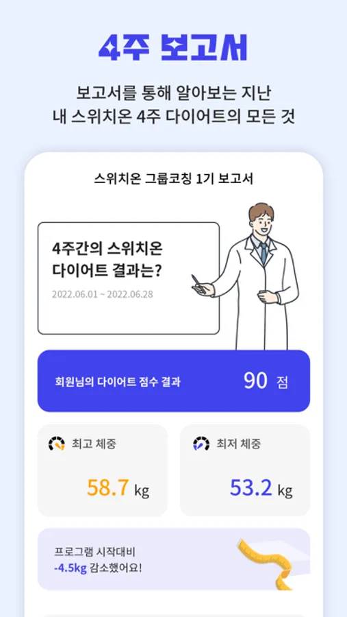 스위치온 4주 다이어트가 끝날 때마다 사용자들은 보고서를 받을 수 있어요. 보고서를 통해 자신이 얼마나 성취했는지, 어떤 부분을 개선해야 하는지 등을 알려드립니다.