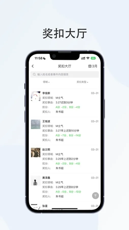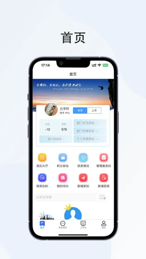 企业内部职工的积分奖扣管理和展示个人和团队排行。