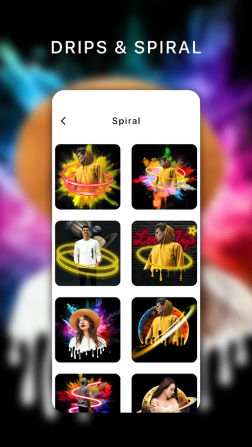 Surprising AI spiral editor has a vast amount of neon spiral options. backgrounds and colorful picture frames are here for you to create marvelous pictures. Combine neon effects and retro filter with neon picture frame collections to edit picture in style. Use motion effect and fx effect to create 3d photo looks