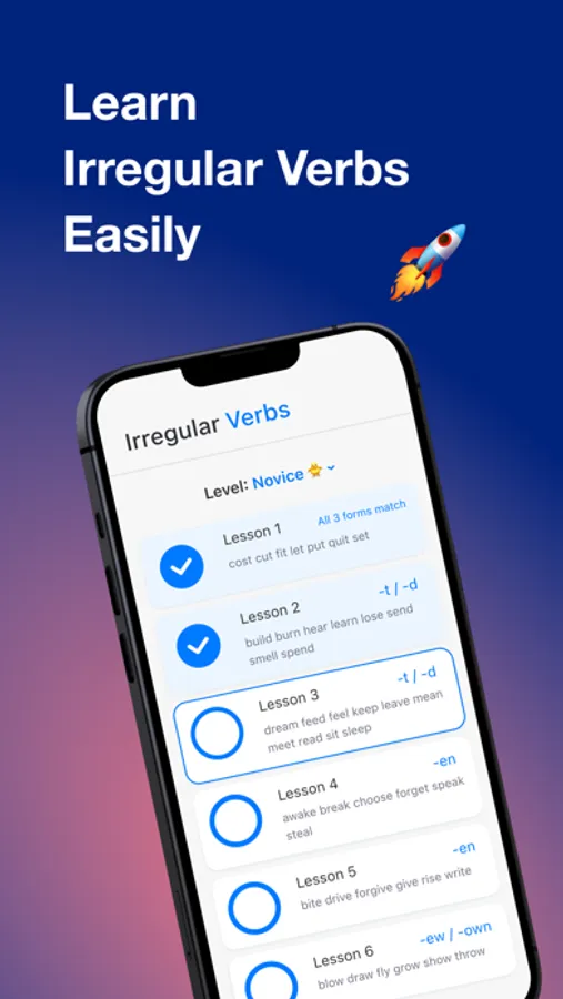 The app helps you learn all 3 forms of each verb through interactive exercises. Choose the correct forms, complete sentences, and unlock new levels as you progress.