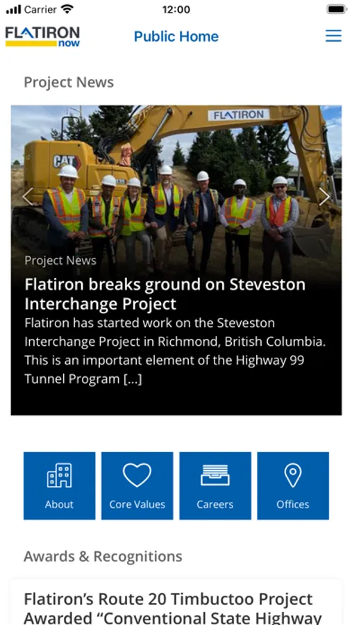 FlatironNow is a communications platform created by Flatiron Construction Corp. to provide company news and important company policy information to employees, prospective employees, partners, clients and other stakeholders. Flatiron is the trusted partner to deliver innovative solutions to infrastructure challenges across the U.S. and Canada. Flatiron collaborates with public and private clients to deliver heavy civil infrastructure—including highways and bridges; aviation, rail and transit; dams and water treatment facilities; and underground projects.