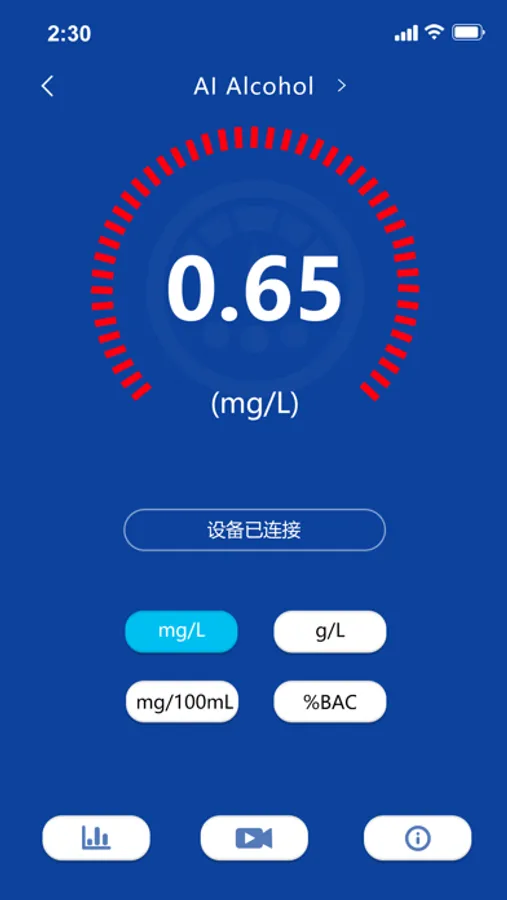 AI Alcoholはスマートアルコールチェッカーの専用アプリです。このアプリにより、ユーザーはアルコールチェッカーの検定結果を直感的に表示されている事ができる。