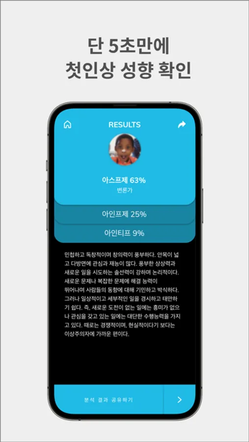 이제, 내 얼굴 혹은 친구의 얼굴 사진 한 장으로 성격유형을 알아보세요.