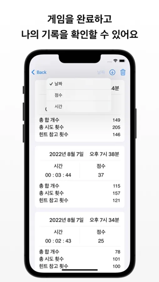 - 플레이 날짜, 점수, 플레이 시간을 기준으로 기록을 정렬할 수 있어요.