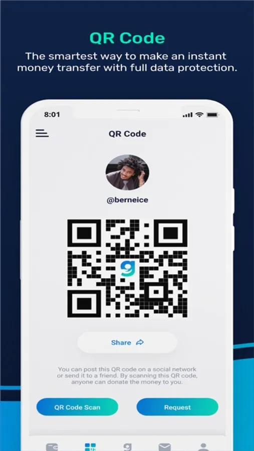 - Send & Receive Money by Scanning the QR Code or by verified social media profile names.