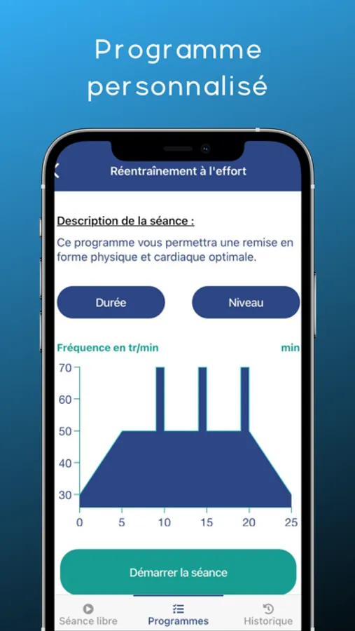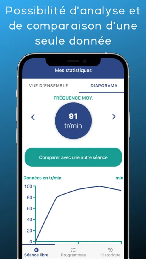 A la fin de chaque séance, ces données sont stockées sur votre smartphone dans le but de les analyser et de les comparer (graphiques / courbes).
