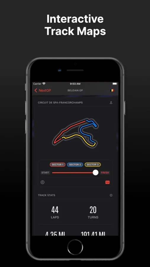 - Interactive track maps allow users to scrub through track maps and see sector breakdowns