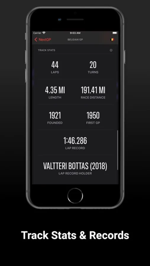 - See detailed stats about each circuit, including lap records, number of laps/ turns, race distance, etc.