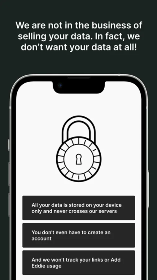 We are not in the business of selling your data. In fact, we don’t want your data at all! All your data is stored on your device only and never crosses our servers. You don't even have to create an account. And we won’t track your links or Add Eddie usage.