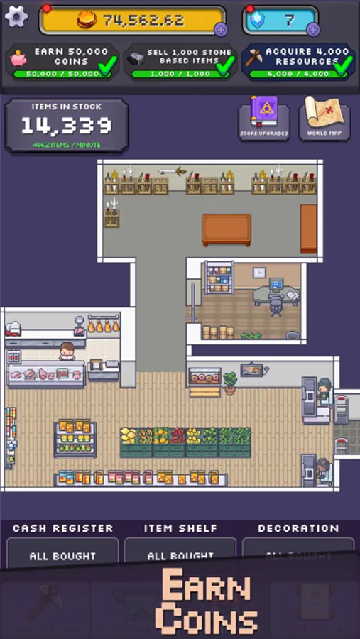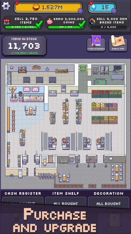 Sell items: After items are created in the factory, you then sell them in your store. Add cashiers, purchase more item shelves, and add decorations to sell more items for larger sums of cash.