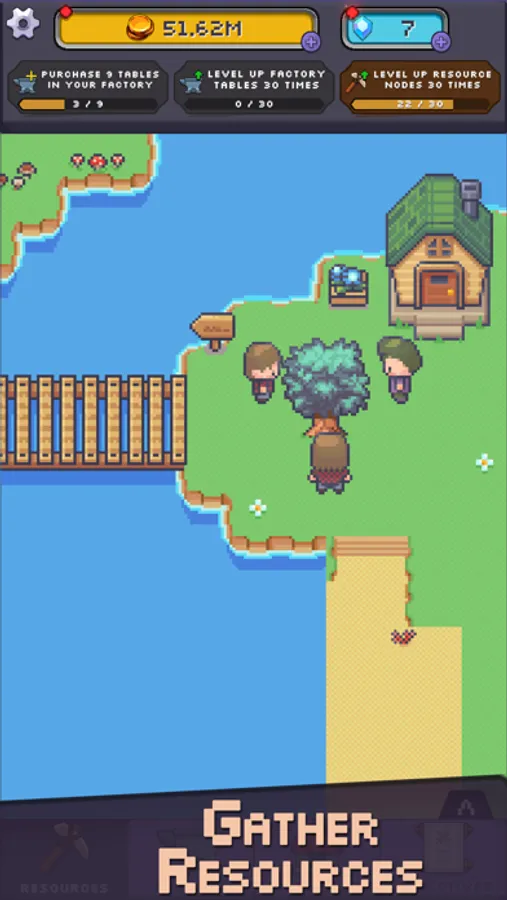 Gather resources: Purchase new resources to extract and then upgrade them to harvest more resources at a time. Purchasing new resources allows for new items to be created in your factory.