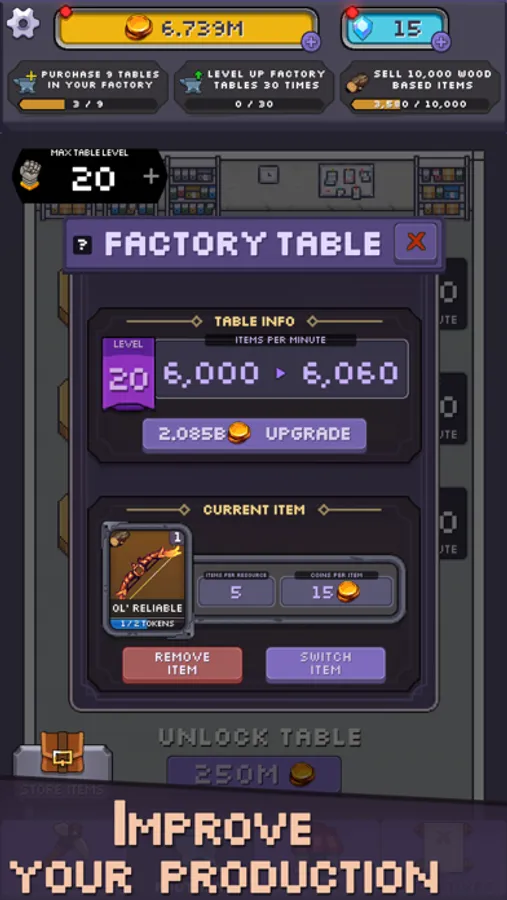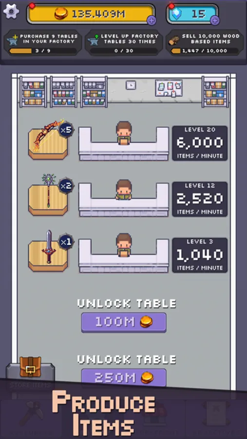 Produce items: Your factory turns raw resources into items that can be sold in your store. Purchase more factory tables to expand production and then level up each table to increase the amount of items created.