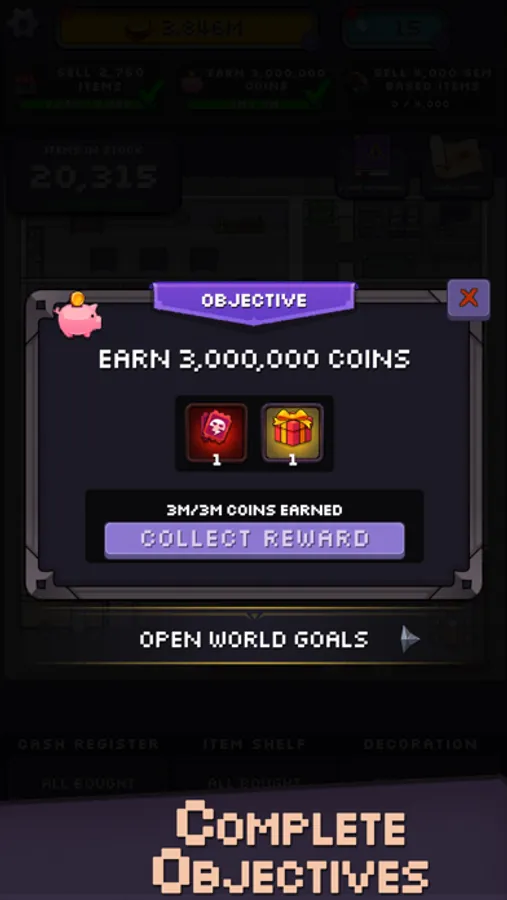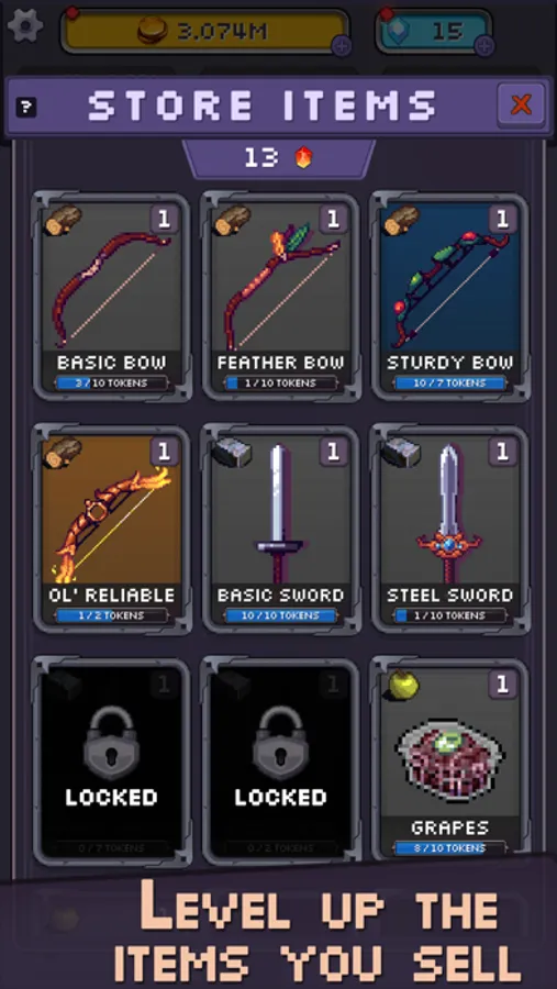 Level up store items: Each item in your store has its own level. Collect store item tokens from completing objectives. Leveling up your store items increases how much of this item you can produce and how many coins you can sell it for.
