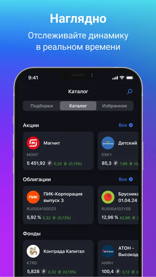 Все инвестиции – это удобный каталог финансовых инструментов со всей нужной информацией в одном приложении. Следите за котировками онлайн. При наличии активов в Портфеле – переоценка позиций по текущим котировкам в режиме реального времени - не упускайте возможности!