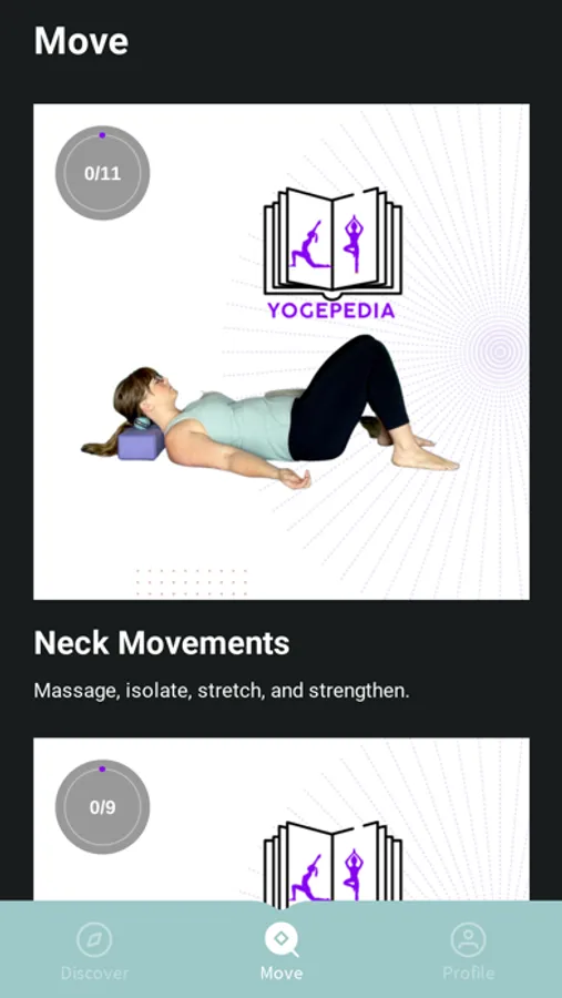 Yogepedia is organized into sections by body part and within each section are sub-sections for self-massage, isolations, stretching, and strengthening. All videos are of individual movements instead of full-length practices.