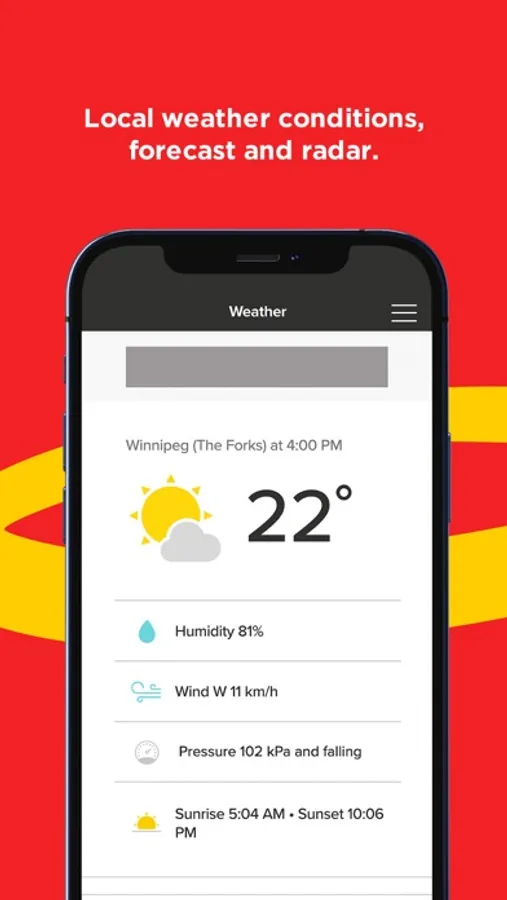 - Live local weather conditions, including hourly and 7-day forecasts and radar maps from Environment Canada