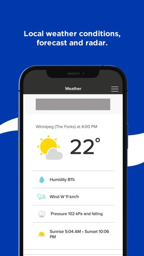 - Live local weather conditions, including hourly and 7-day forecasts and radar maps from Environment Canada