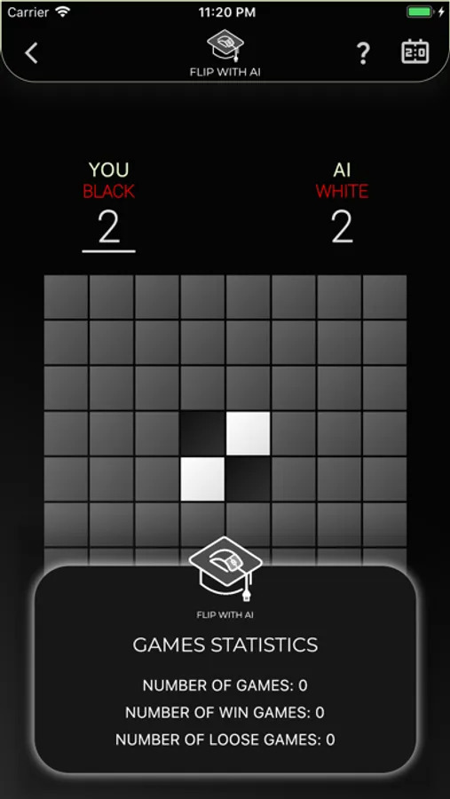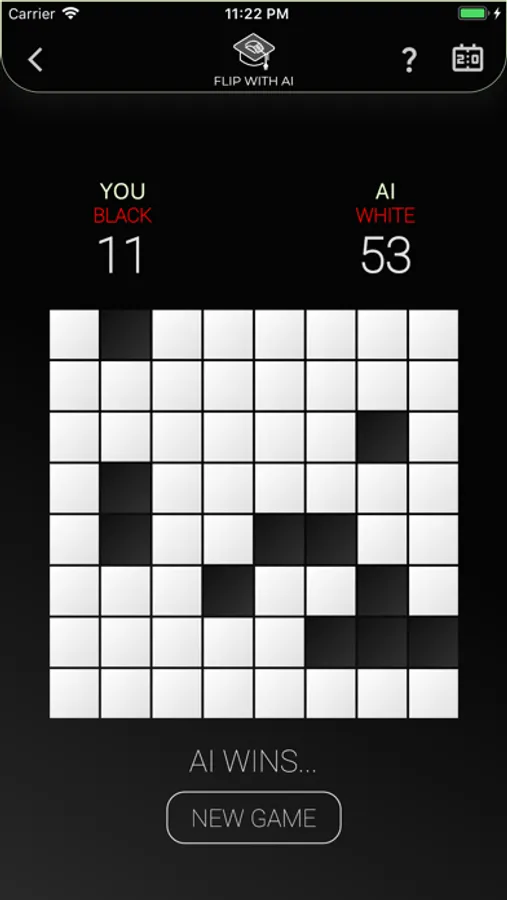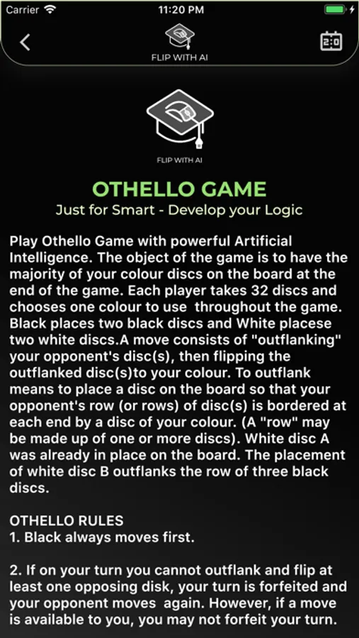 Play Othello Game with powerful Artifical Intelegence. The object of the game is to have the majority of your colour discs on the board at the end of the game. Each player takes 32 discs and chooses one colour to use throughout the game. Black places two black discs and White placese two white discs. A move consists of "outflanking" your opponent's disc(s), then flipping the outflanked disc(s)to your colour.