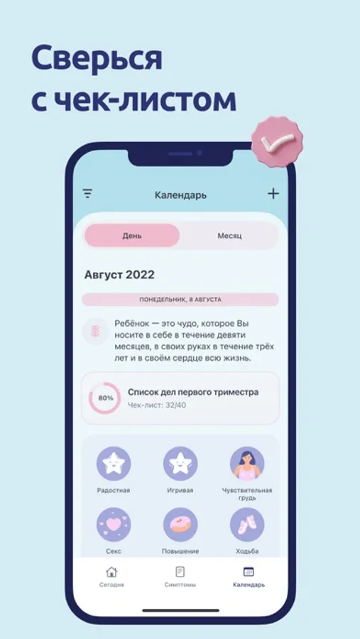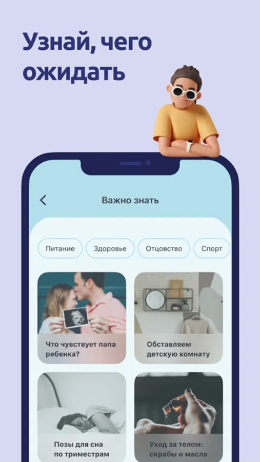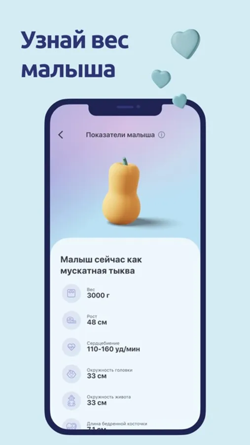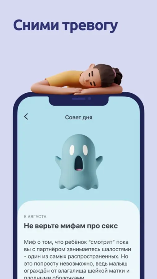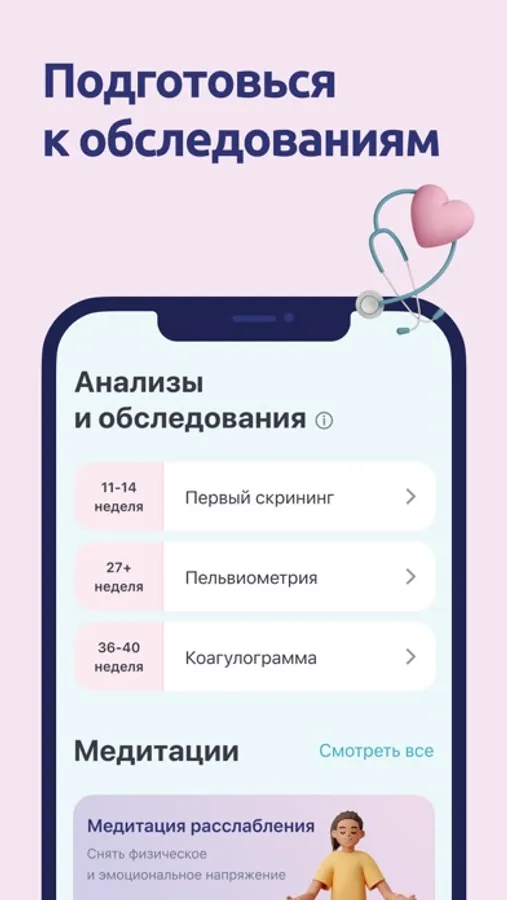 Приложение не заменяет консультации врача. Оно помогает лучше понимать процесс беременности, чтобы говорить с врачом на одном языке.