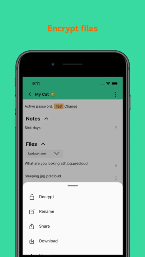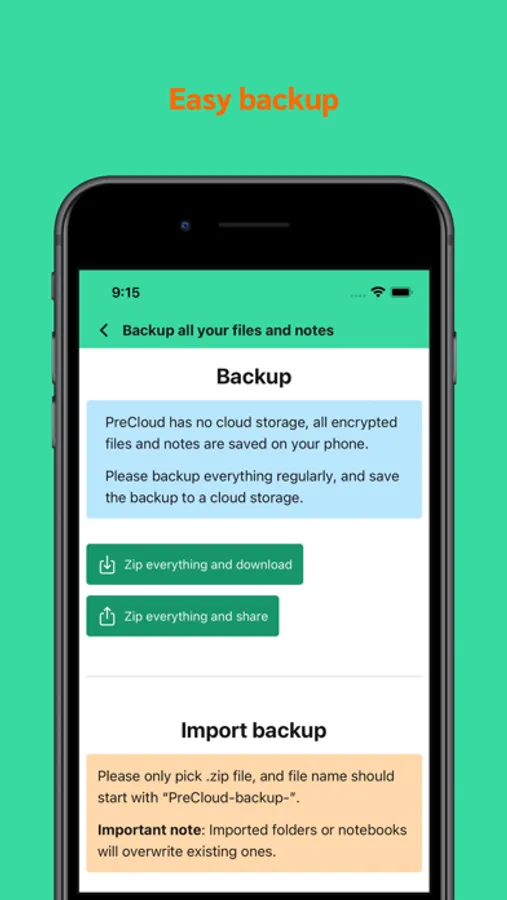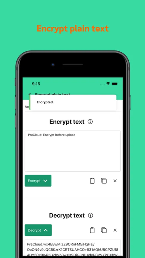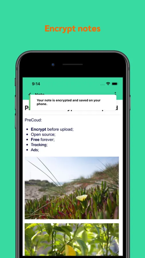 PreCloud has no server, everything happens on your device: your passwords, the encryption process, the encrypted files and notes.