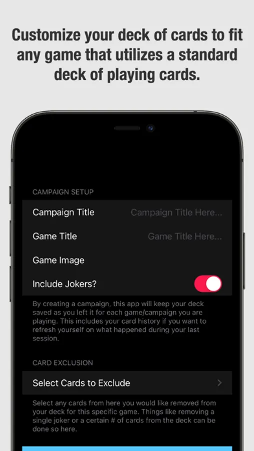 - Customize each campaign's deck to match the ruleset from the game you are going to play. Need to remove jokers? Easy. Need to remove only the face cards from your deck? No problem!