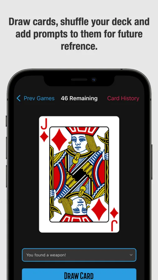 This application was built for those people who would like a digital deck of cards for their solo roleplaying games but keeping the decks separate from one another so you don't need to share that one physical deck of cards at your home between games. It also helps with little kids around the home that find your physical deck of cards and decide to mess up the state of the deck or lose cards altogether.