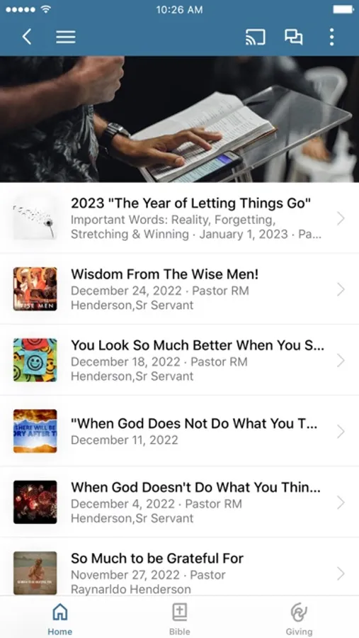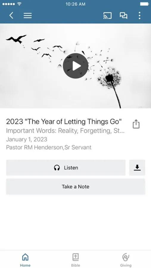 This app will help you stay connected with the day-to-day life of our church. With this app you can: watch or listen to past messages; stay up to date with push notifications; share your favorite messages via Twitter, Facebook, or email; and download messages for offline listening.