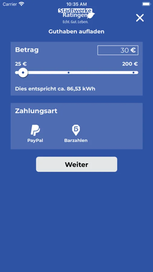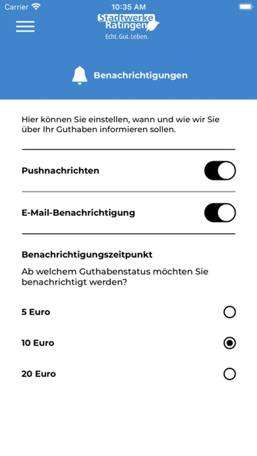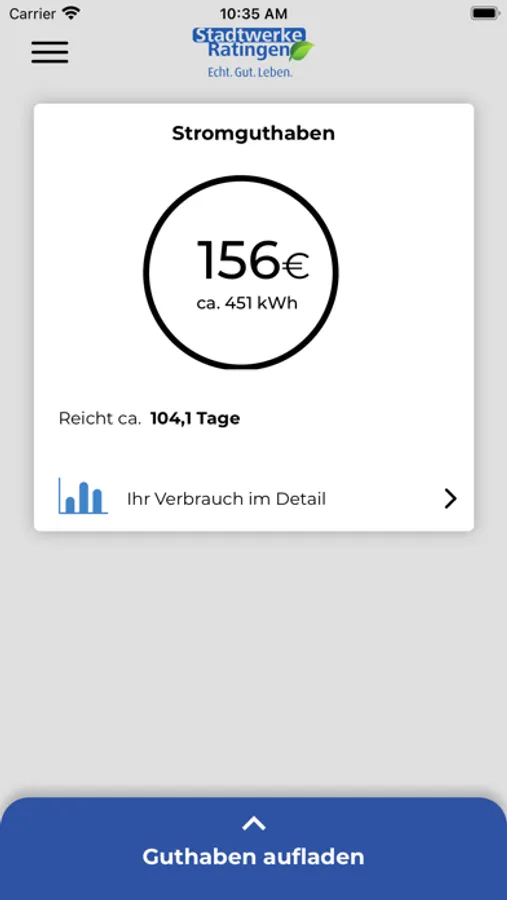 Mit der Echt.Strom-Prepaid App der Stadtwerke Ratingen behalten Sie die volle Kontrolle über Ihre Stromkosten. Denn mit der App laden Sie ganz einfach Ihr Stromguthaben auf und verbrauchen dann das, was Sie bezahlt haben. Mit der App haben Sie jederzeit einen Überblick über Ihr aktuelles Stromguthaben, Ihre bisherigen Guthabenkäufe (Quittung inklusive) sowie eine Verbrauchsübersicht zu Ihrem Stromverbrauch. Sollte Ihr Stromguthaben einmal knapp werden, erhalten Sie auf Wunsch eine automatische Benachrichtigung per Mail oder als Push-Nachricht. Die App kann nur nach Vertragsabschluss und in Verbindung mit dem Tarif Echt.Strom-Prepaid der Stadtwerke Ratingen genutzt werden.