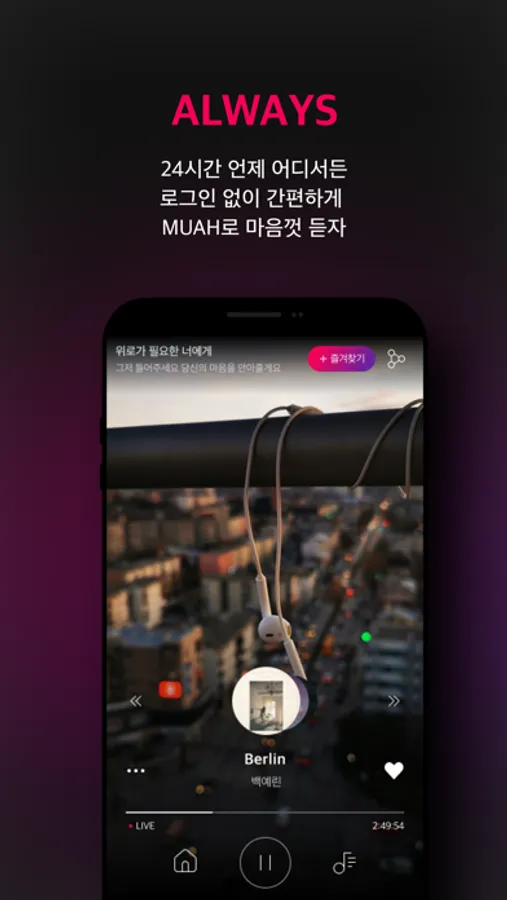 뮤아는 24시간 언제 어디서든 음악을 감상할 수 있어요!