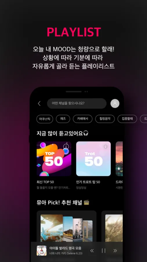뮤아는 상황에 따라 기분에 따라 자유롭게 플레이리스트를 고를 수 있어요!