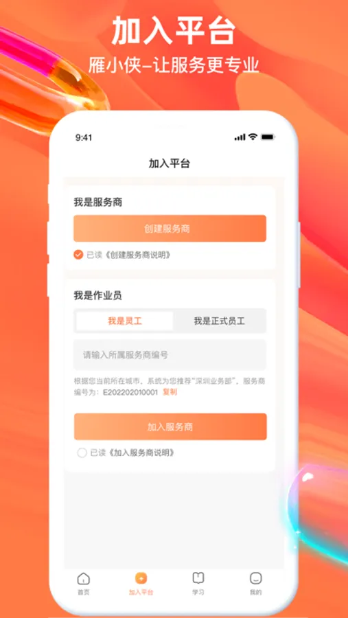 加入服务商:支持一键加入服务商,加入后由服务商团队指派任务或参与抢单