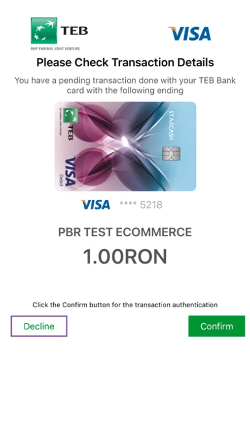 A new security application from TEB SH.A Bank for online transaction of credit and debit cards for 3D Secure validations. Whenever you try to make e-commerce card transaction from your computer or mobile phone, you can approve your transaction through our new application. Application will make the biometric validation then you can approve your transaction by only clicking approve button. Also you will have ability to see your active cards and last transactions in the application.