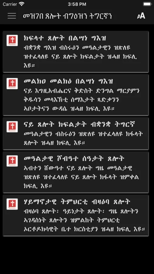 Mezgebe Tselot is the great Ethiopian Orthodox Tewahedo Church collection of prayer books and is available in a variety of languages including Amharic, Geez, Afan Oromo, Tigrinya, English and Arabic. It is the best and biggest common book of prayers for Christians. The application includes a collection of more than 100 Orthodox prayers in the daily prayers, the prayer of saints, Image of saints, Psalms, praises of saint Mary and Jesus, and more other prayers.