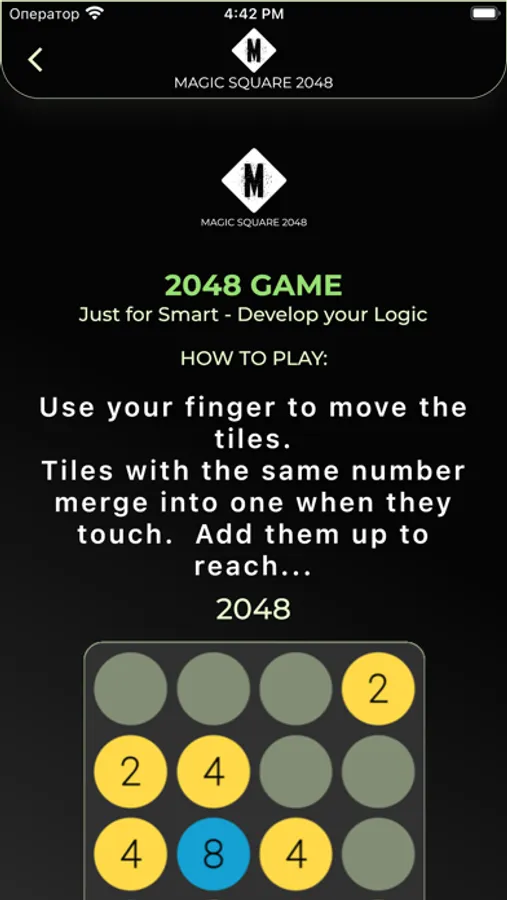 Magic Square 2048 is a single-player sliding tile puzzle game. The objective of the game is to slide numbered tiles on a grid to combine them to create a tile with the number 2048, however, one can continue to play the game after reaching the goal, creating tiles with larger numbers. Strategies in Magic Square 2048 include keeping the highest tiles in a specific corner and to keep that tile in that corner and to fill the specified row with the highest numbers.