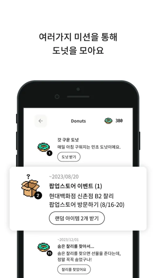 - 매일 출석해 갓 구운 도넛을 받아요!