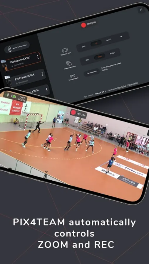 The PIX4TEAM Camera application allows you to automatically film your sport game with your smartphone / tablet mounted on the PIX4TEAM robot-cameraman.