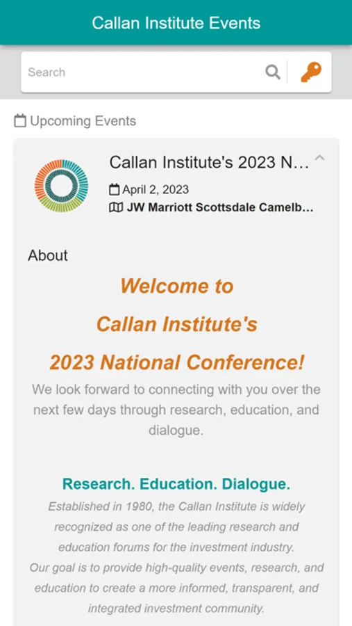 On the Callan Institute Event app, conference attendees will have access to important information including the following: Agenda/Schedule, Speaker Information, and Biographies, Conference Logistics and Activity Details, Downloadable Presentations and Research, and Live Event Reminders/Updates.