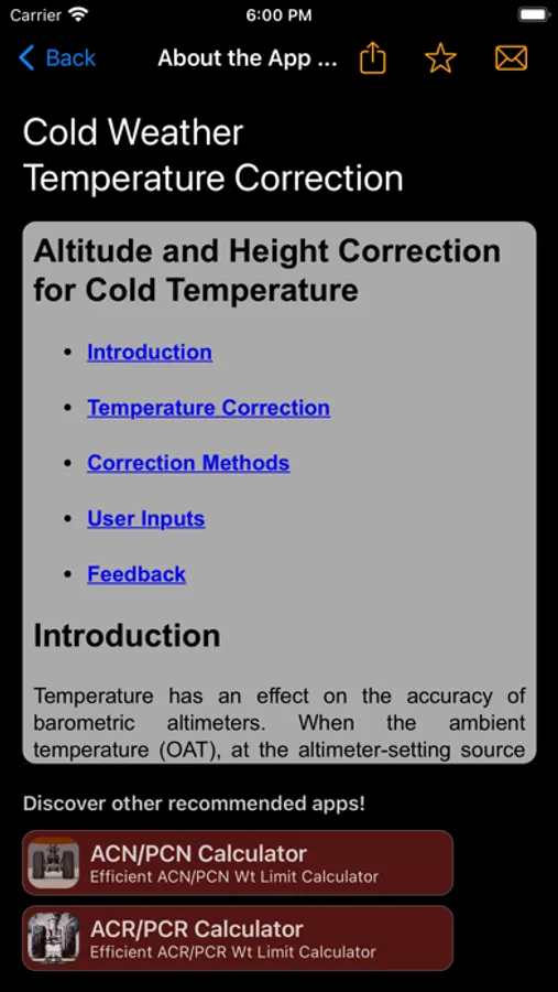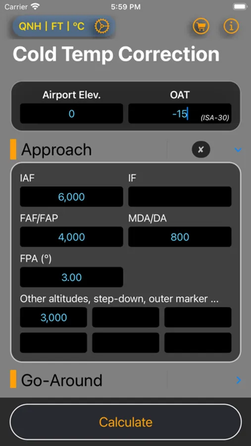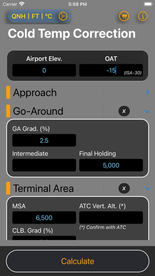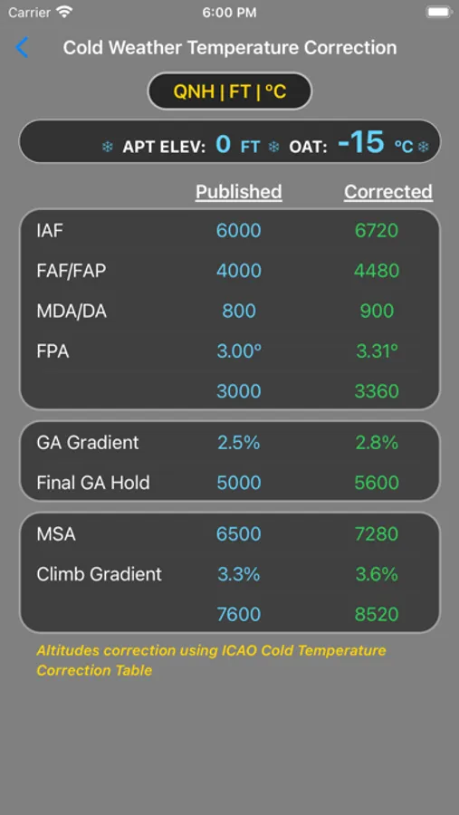 When the Outside Air Temperature (OAT) falls below the International Standard Atmosphere (ISA), the aircraft's true altitude is lower than the indicated altitude. Extremely low temperatures can pose a terrain hazard and lead to altitude or position errors. To mitigate these effects, adjustments must be made to the heights above the airport elevation by either raising obstacle heights or adjusting published altitudes/heights. This App assists pilots in making these corrections using the ICAO Cold Weather Temperature Correction table or using the engineering equations, following the guidelines of PANS-OPS.